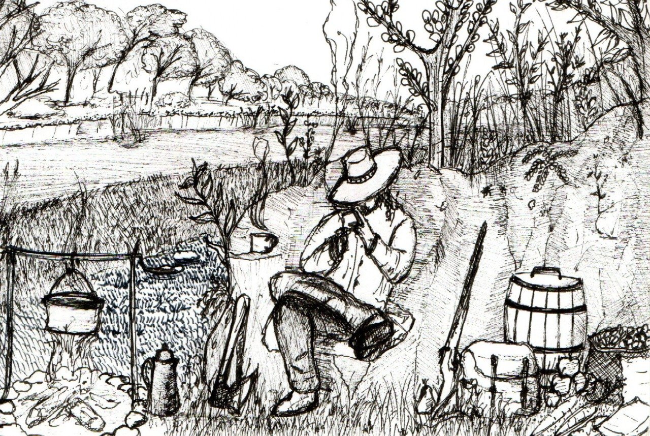 Print de um desenho original. Representa a paz de um acampamento tranquilo à beira do rio. Feito originalmente em papel tamanho A6, com caneta nankin. Limite de 5 downloads por compra.